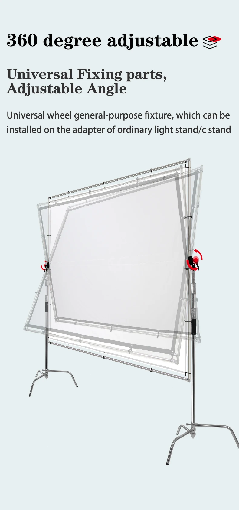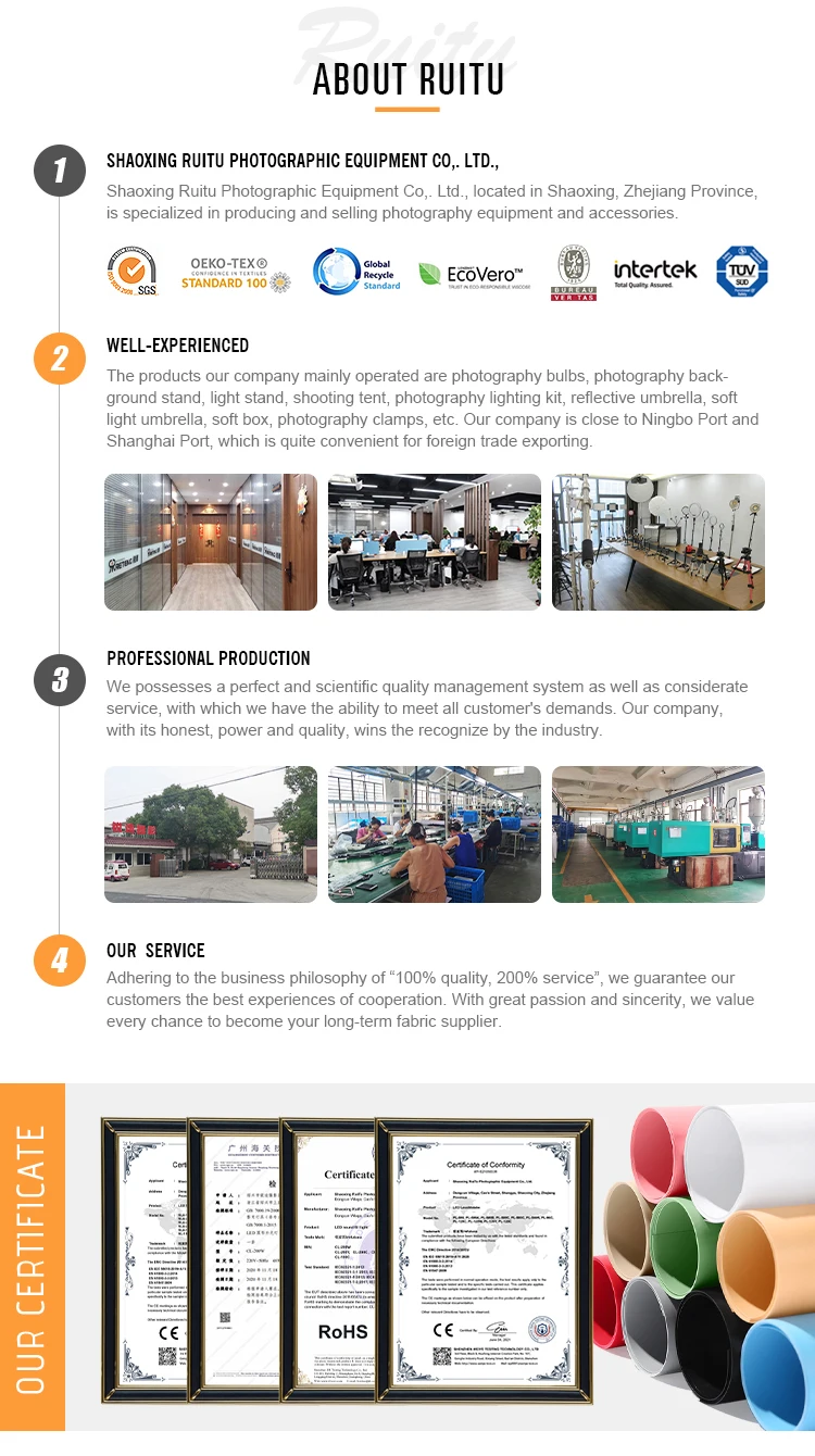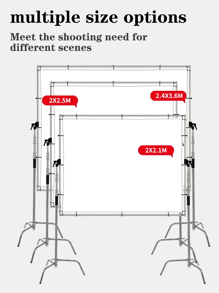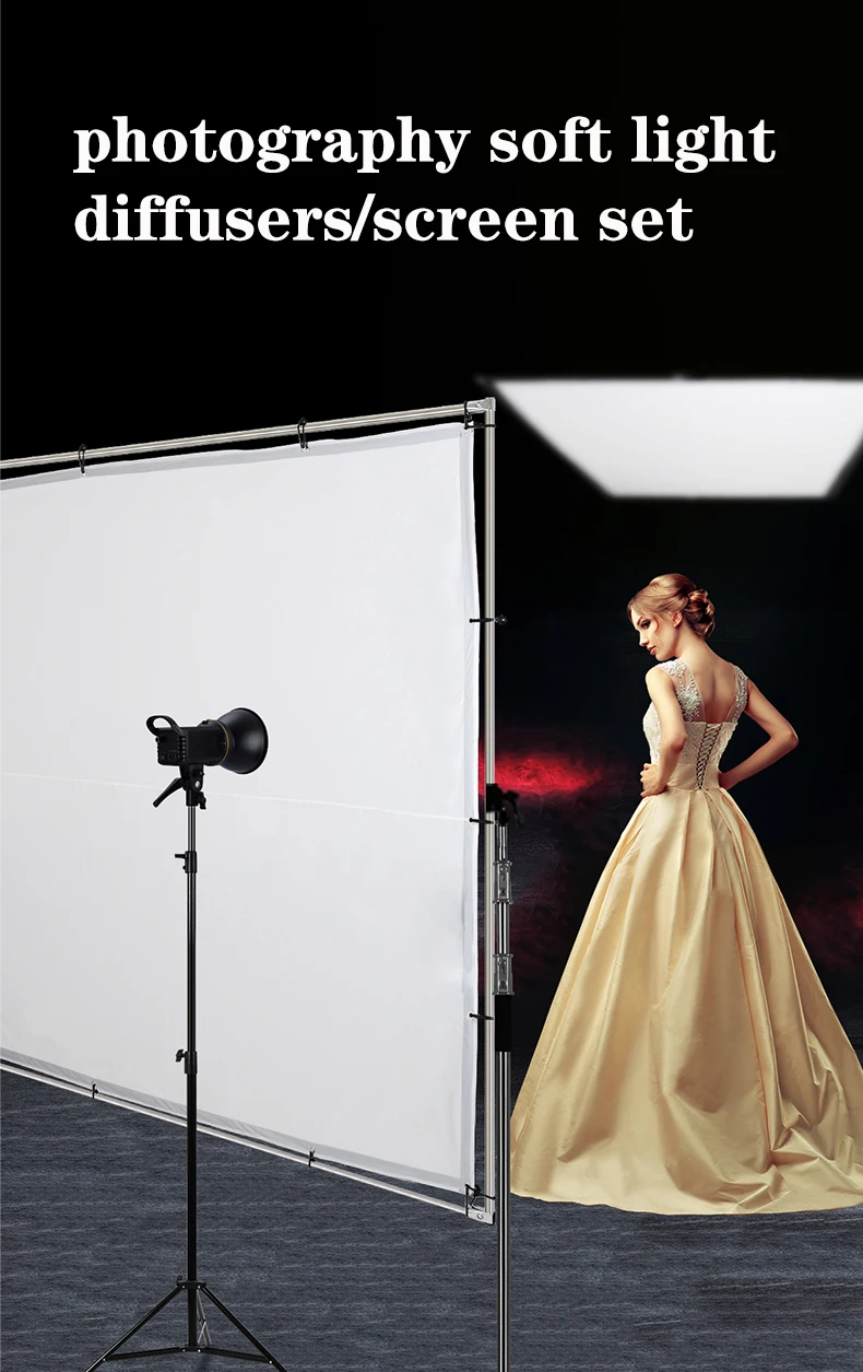 Product Name Scrim Diffusion Butterfly Frame Screen Material Aluminum+ Cloth Size 2x2.5M Weight 5kg 1. The choice of soft light for large-scale commercial photography. 2. Quick-installation portable large-scale photography soft light diffusers, Integrated framework 3. Universal wheel general-purpose fixture, which can be installed on the adapter of ordinary light stand /C stand 4. Professional soft light,Cross Check Starlight Soft Light Cloth 5. High-strength elastic rope easy to install 6. Stainless steel round hole protects the cloth surface and prevents tearing 7. Elastic rope fixed, stainless steel round hole protection, effectively tighten the cloth. 8. Don't include support tripod stand.1. Q: Are you a manufacturer or trading company? A: We are professional manufacturer of video light, light stand, backdrop, background stand, softbox, light box, in Shaoxing. 2. Q: How to place an order ? A: “Start Order” “Choose the quantity, colors” “Filling your address" Or you could "Send inquiry" to us, we will fast reply within 1 hours of work time. 3. Q: What are the terms of payments you offer? A: We accept payment via T/T, L/C, Visa, WesternUnion, PayPal. 4. Q: When will make delivery? A: Delivery Time -Sample Order:1-3 days after receipt of the full payment. -Stock Order:1-7 days after receipt of the full payment. -OEM Order:15-30 days after receipt of the deposit. 5. Q: What kind of transportation methods you offer? A: Ocean, Railway,Chinapost, DHL, UPS, FedEx, TNT and EMS.