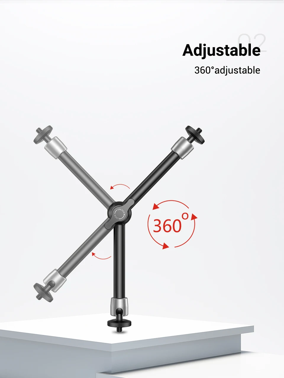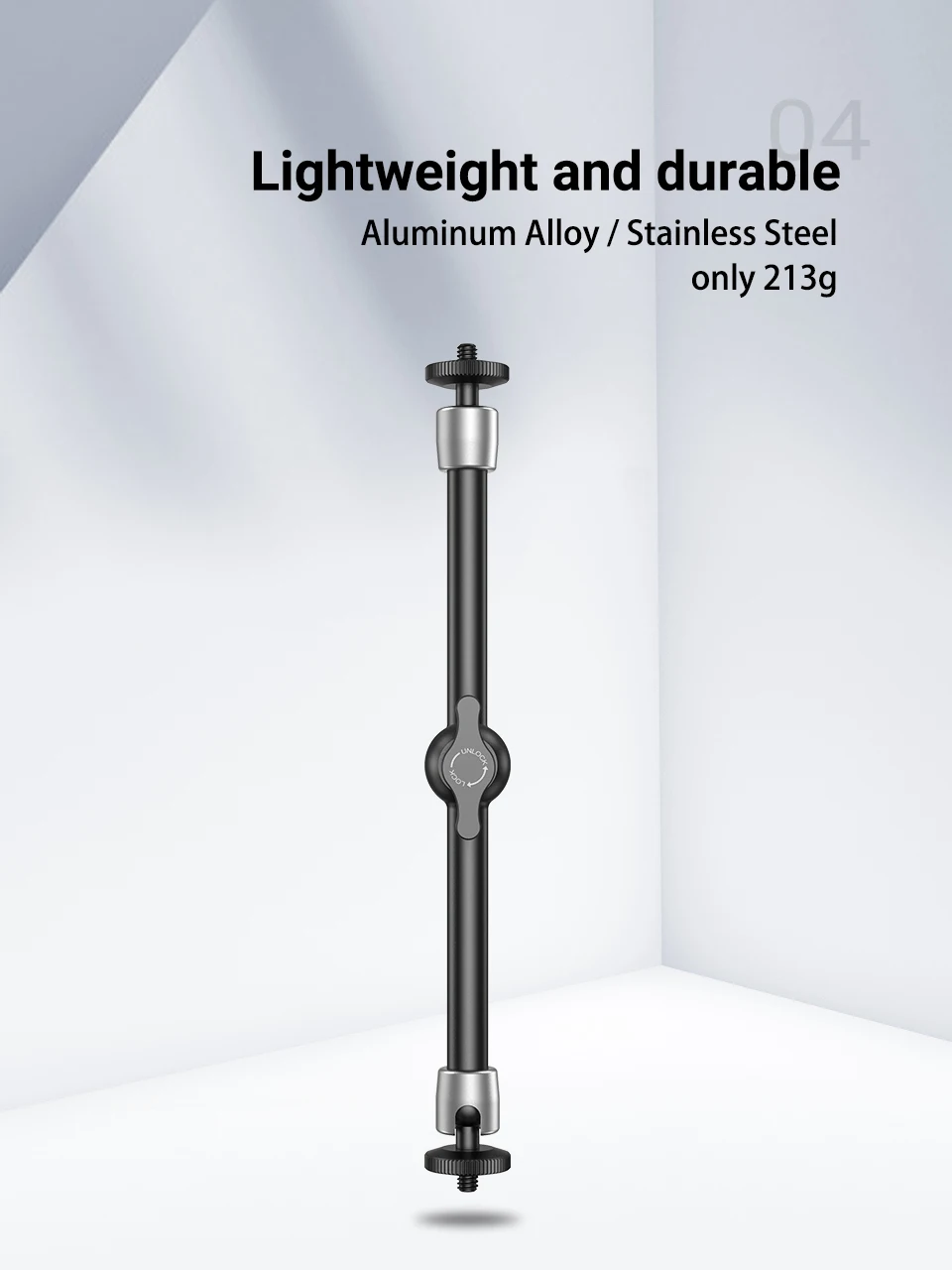 SmallRig Crab-Shaped Clamp & Magic Arm (11’’) with Cold Shoe 3726 consists of a crab-shaped clamp and a magic arm (11"). It is made of aluminum alloy and stainless steel to increase robustness and durability. Particularly, the clamp features 1/4"-20 and 3/8"-16 threads and maximum/minimum open distance of 54mm and 15mm; the magic arm has a 1/4"-20 screw at one end and a cold shoe at the other, allowing being mounted onto such accessories as a cage, LED light, microphone, monitor, as well as double ball heads that enable 360-degree adjustment as needed. The magic arm together with the clamp quickly connects cameras, monitors, lights and other equipment with pipe posts, tables, bike bars, etc. Both the clamp and the magic arm are fitted with rubber pads to prevent scratches and help lock equipment in place.