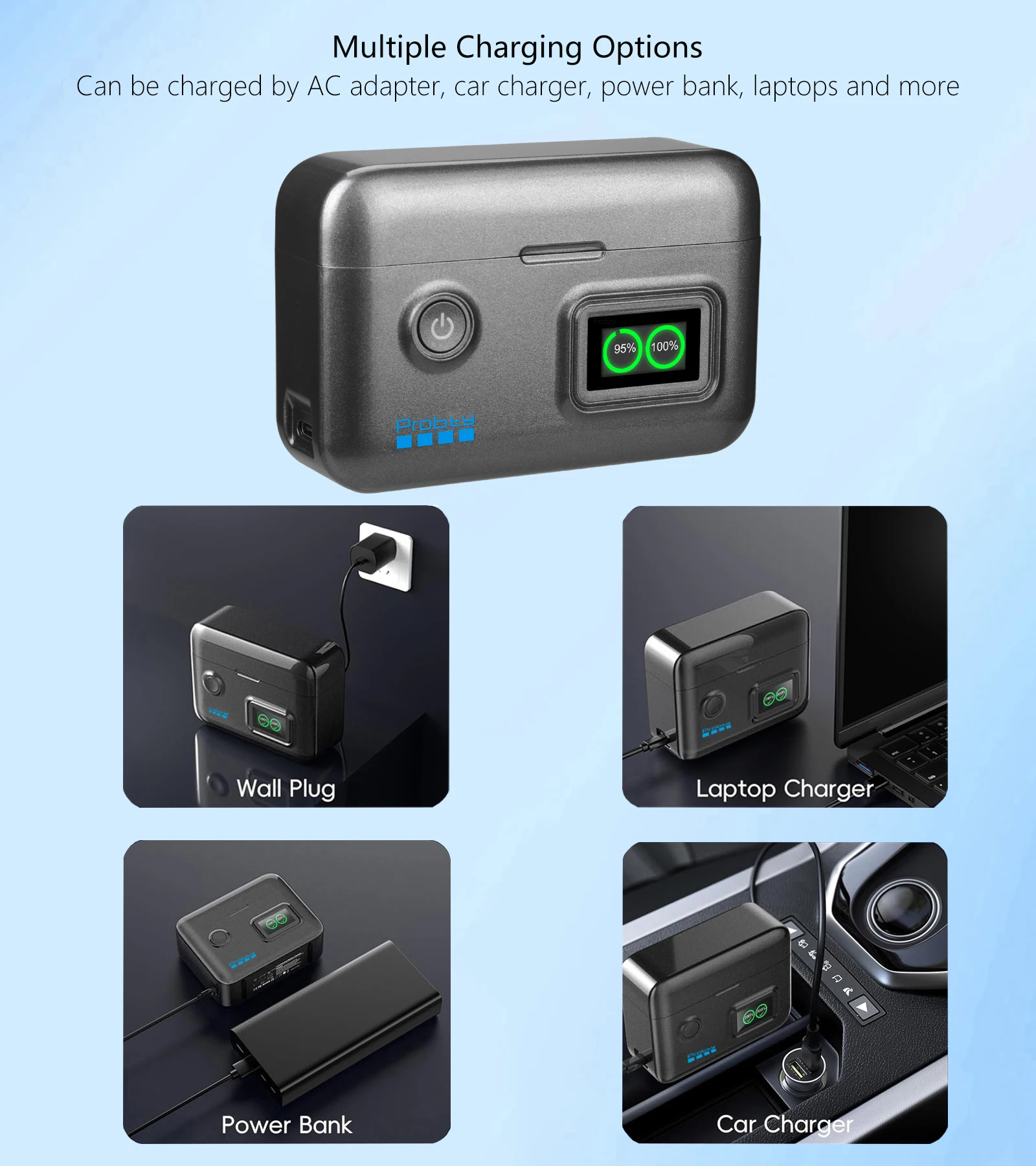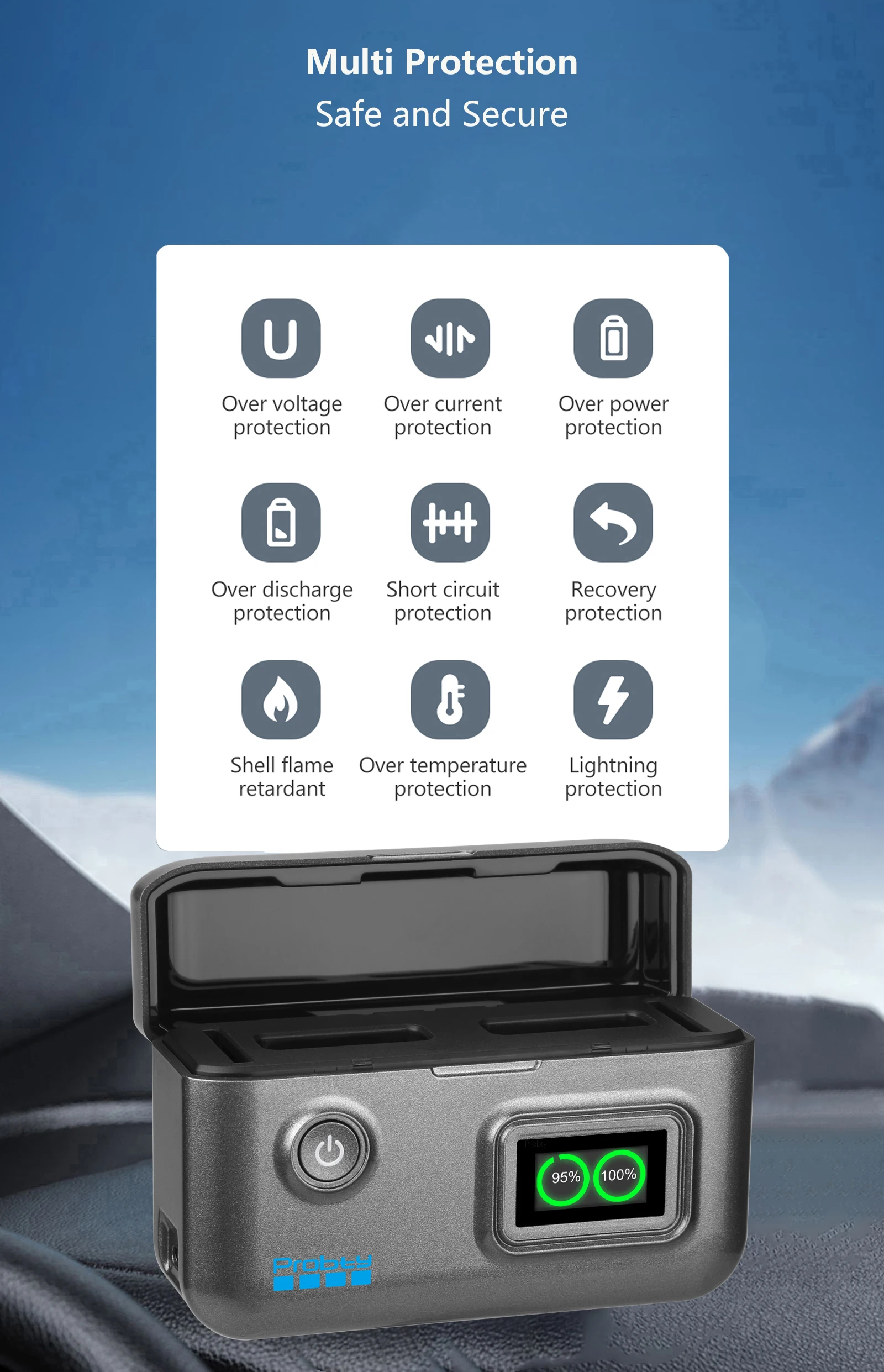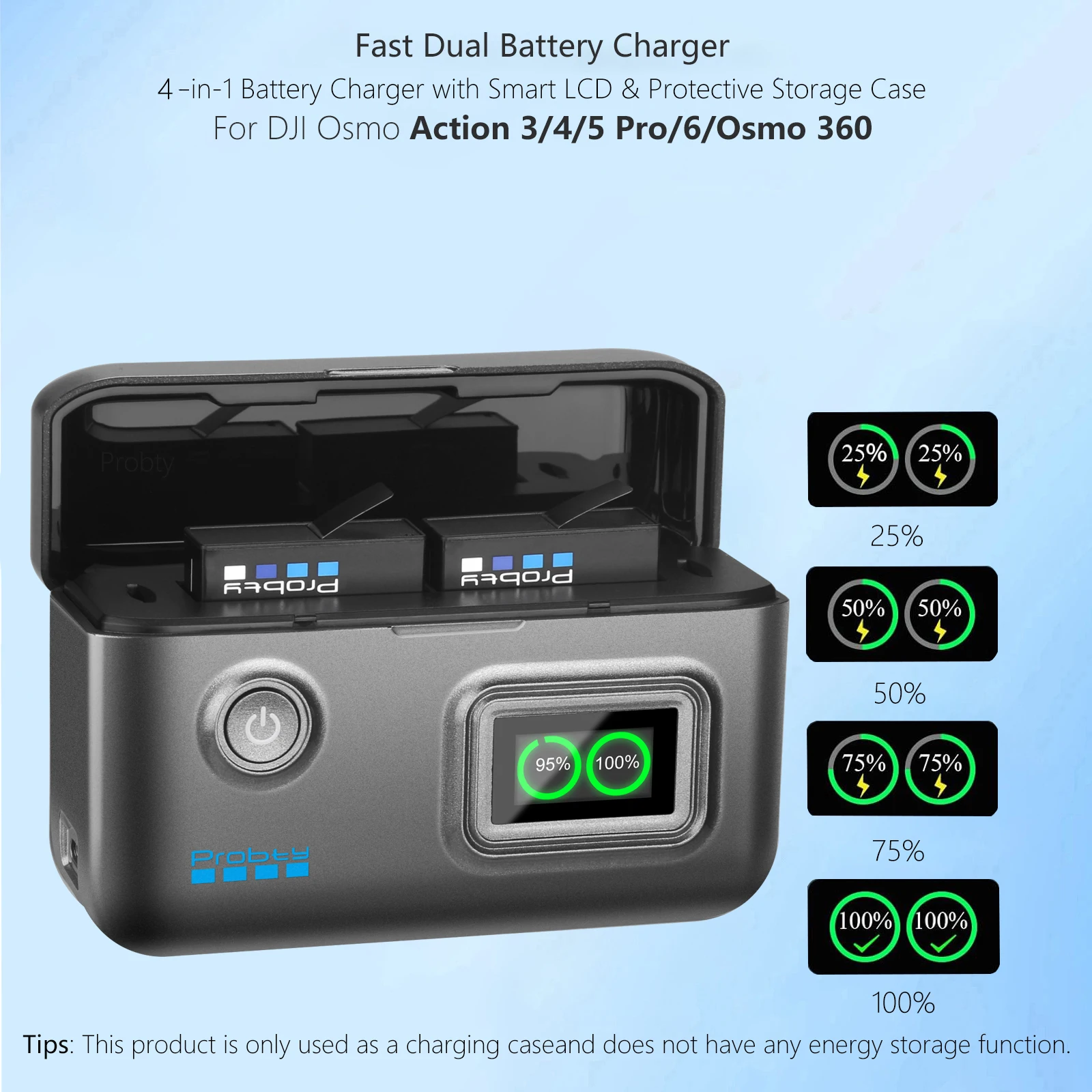 Compatible Models:For DJI Osmo Action 6For DJI Osmo 360For DJI Osmo Action 3/Action 4/Action 5 ProBattery Specifications:Battery Type: Li-ion BatteryVoltage: 3.87VCapacity: 2200mAh/8.5WhMax Charge Voltage:4. 50VAmbient temperature: -20℃ to 45℃15W Fast Charger Parameter:lnput: 5V/3A 15WOutput: 4.45V -1A(x1)/0.75A(X2)Size:107*36*69.5mmThe front of the charger has button switches and anLCD display screen.Power on: The LCD display screen is constantly on.showing the current battery level.Charging: Green battery level display flashing.Full: Green battery level display is full.Features:1.15W Ultra-Fast Charging with 2-Pack Action 6 Batteries:Experience rapid charging with PD3.0 and QC3.0 technology,delivering full power to two Action 6 2200mAh batteries in just 1.5 hours.2.Dual Charger with Digital Power Monitoring: This compact charger doubles as a storage boxfor 2 batteries and 2 SD cards, giving you full control and confidence during every shoot.Package content:As you choose