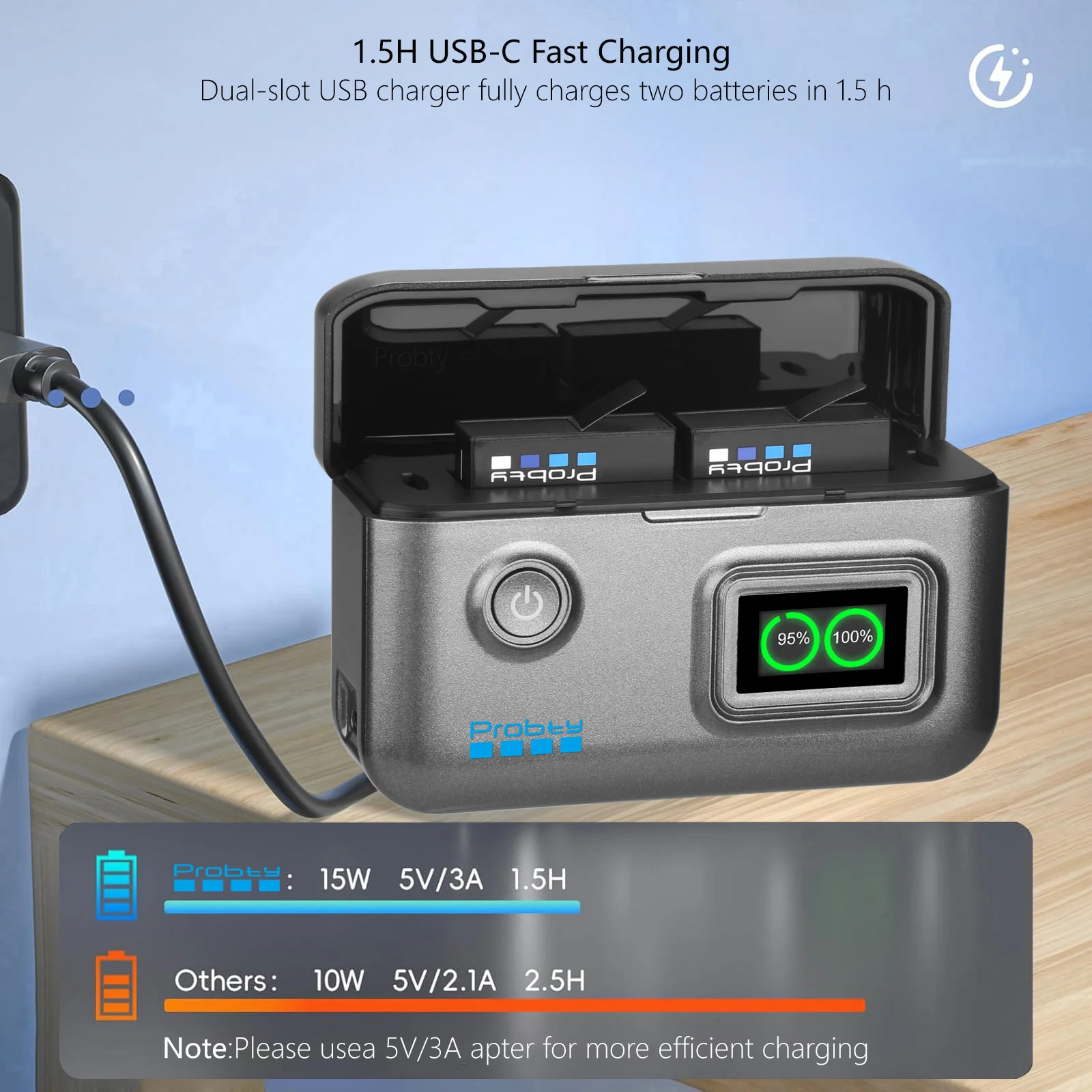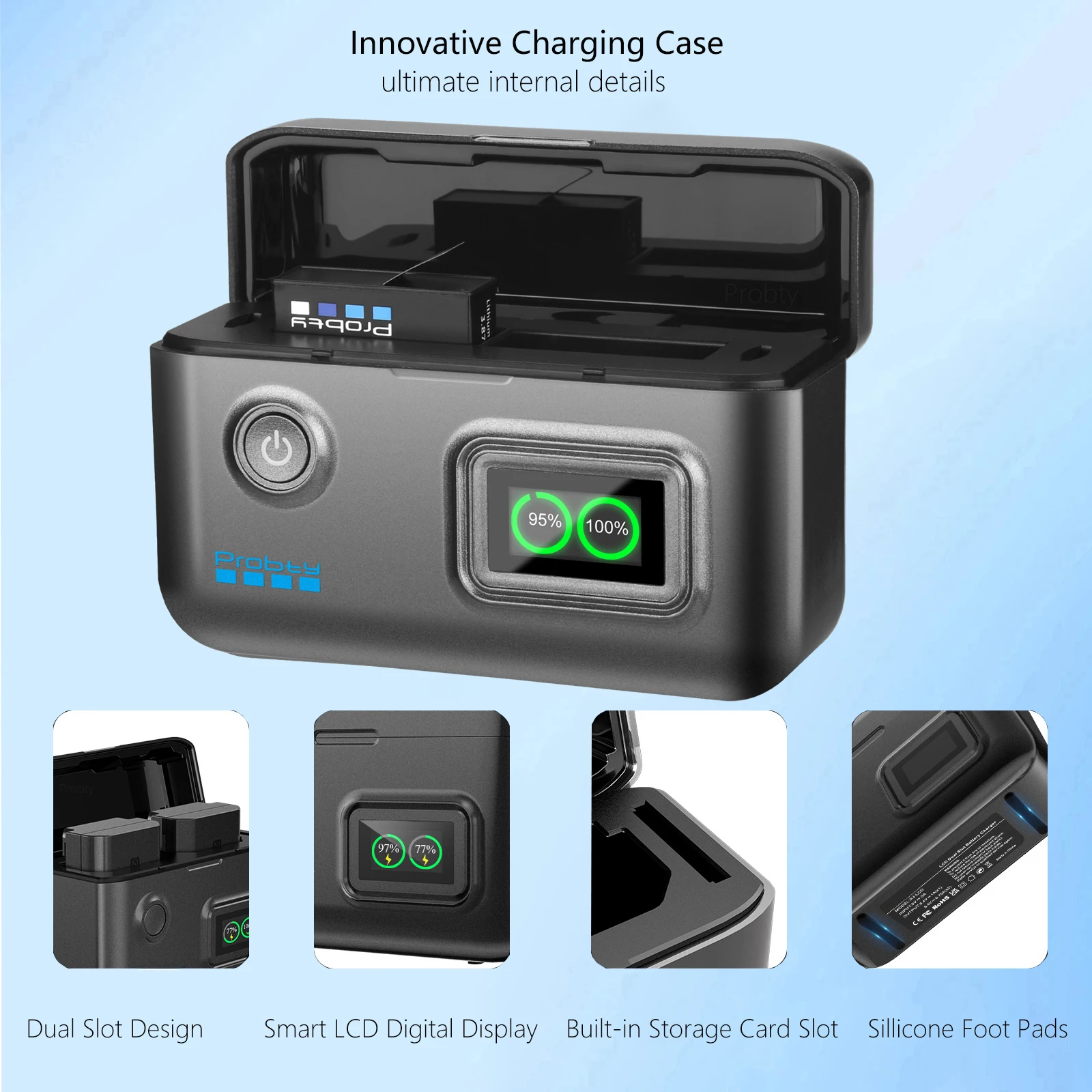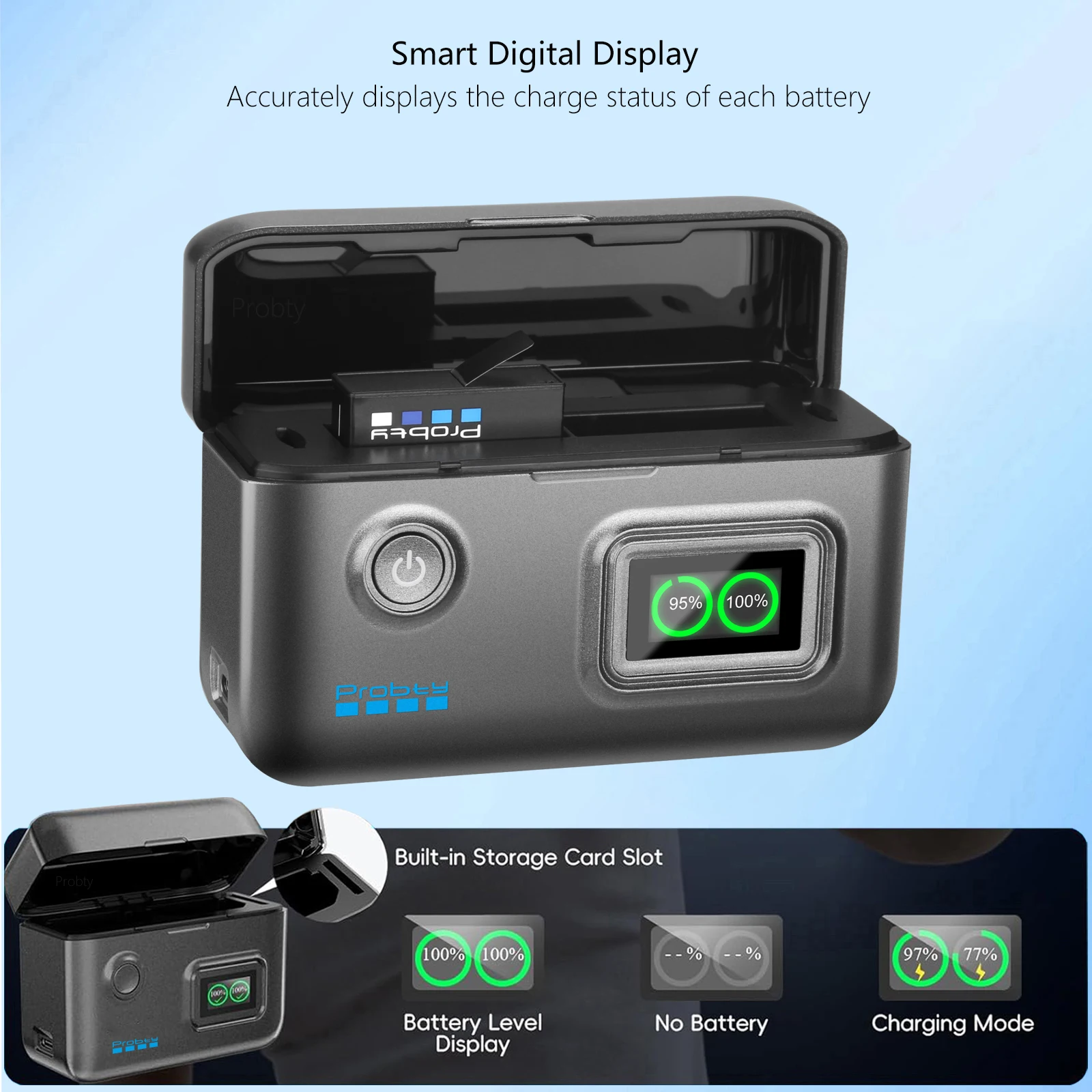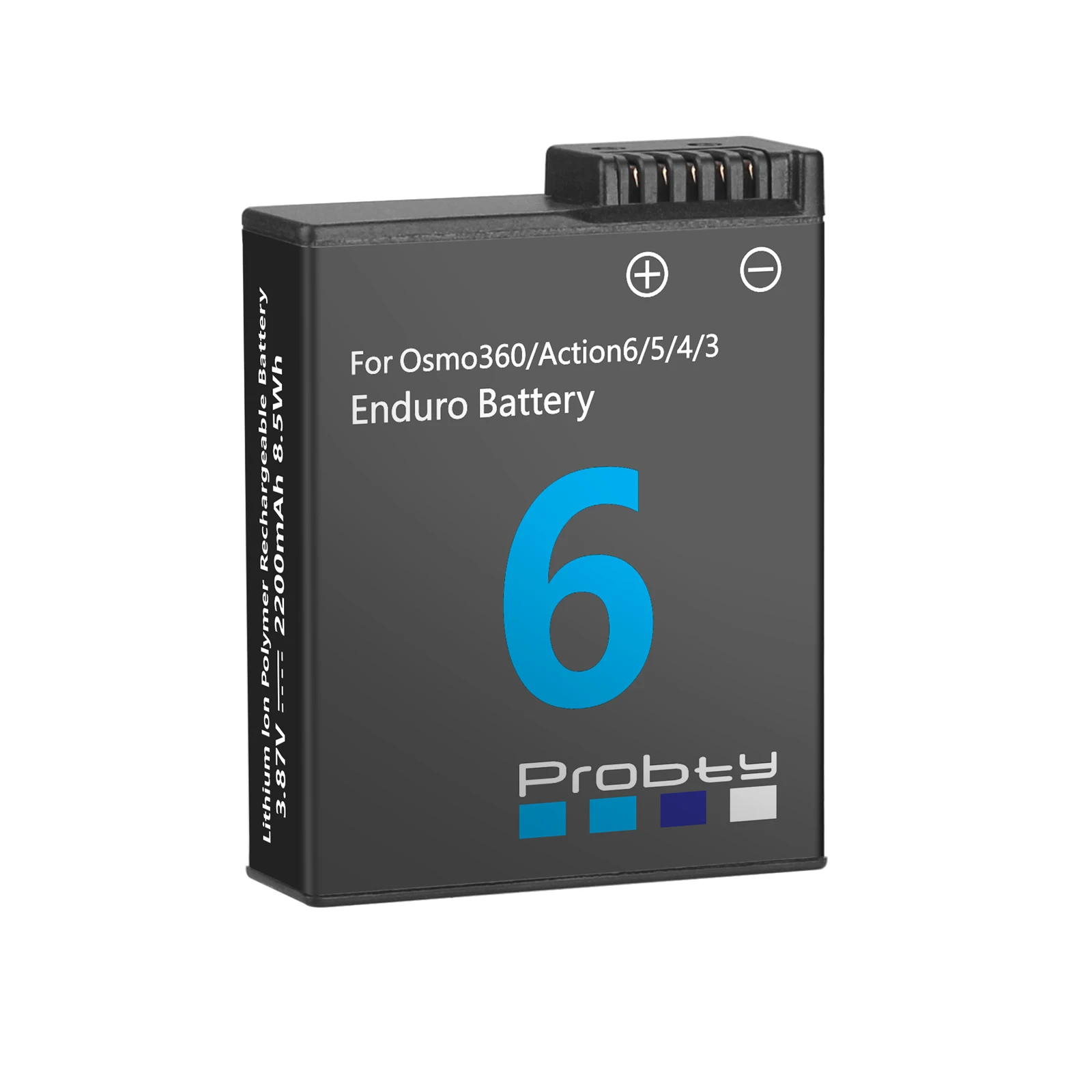 Features:1.15W Ultra-Fast Charging with 2-Pack Action 6 Batteries:Experience rapid charging with PD3.0 and QC3.0 technology,delivering full power to two Action 6 2200mAh batteries in just 1.5 hours.2.Dual Charger with Digital Power Monitoring: This compact charger doubles as a storage boxfor 2 batteries and 2 SD cards, giving you full control and confidence during every shoot.Compatible Models:For DJI Osmo Action 6For DJI Osmo 360For DJI Osmo Action 3/Action 4/Action 5 ProBattery Specifications:Battery Type: Li-ion BatteryVoltage: 3.87VCapacity: 2200mAh/8.5WhMax Charge Voltage:4. 50VAmbient temperature: -20℃ to 45℃15W Fast Charger Parameter:lnput: 5V/3A 15WOutput: 4.45V -1A(x1)/0.75A(X2)Size:107*36*69.5mmThe front of the charger has button switches and anLCD display screen.Power on: The LCD display screen is constantly on.showing the current battery level.Charging: Green battery level display flashing.Full: Green battery level display is full.Package content:As you choose