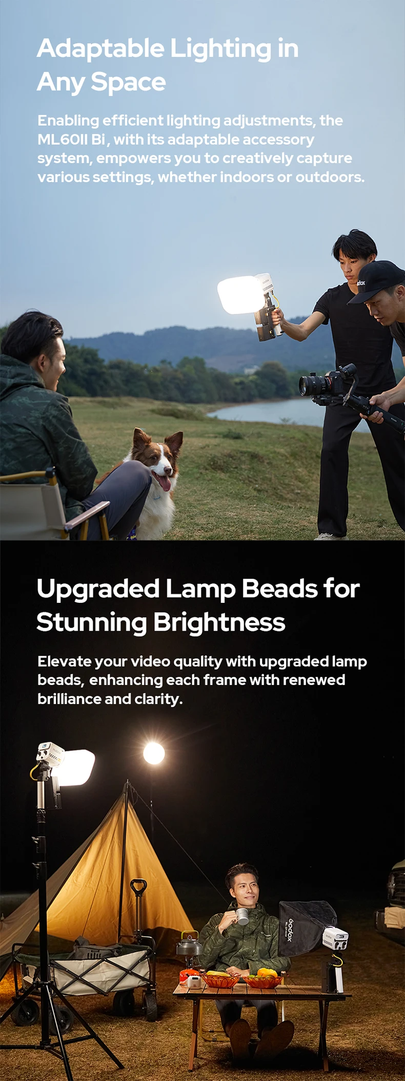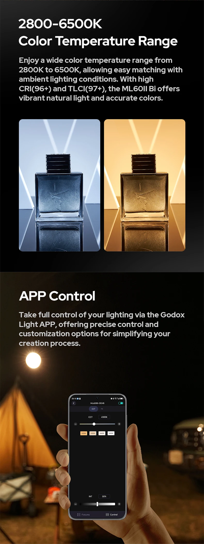whether indoors or outdoors,Elevate your video quality with upgraded lamp beads enhancing each frame with renewed brilliance and clarity.Enjoy a wide color temperature range from 2800K to 6500K, allowing easy matching with ambient lighting conditions. With high CRI(96+) and TLCI(97+), the ML60II Bi offers vibrant natural light and accurate colors.
