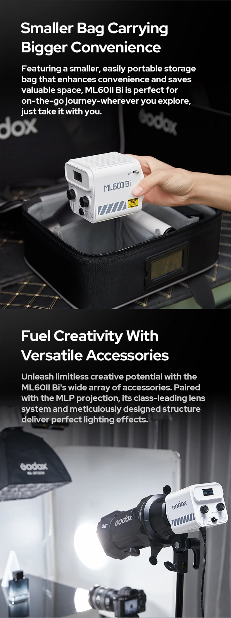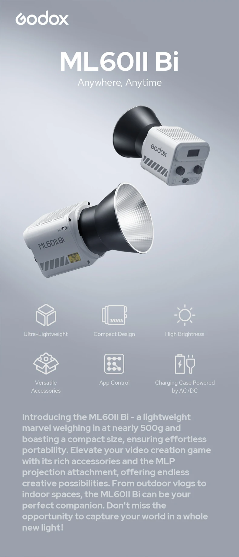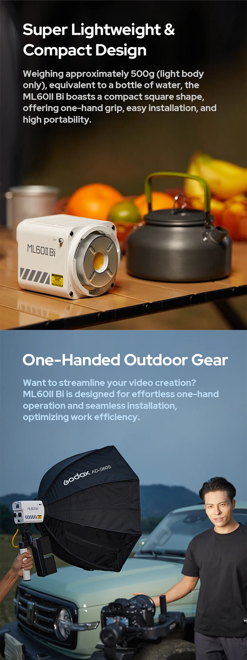 Super Lightweight and Compact Design.Weighing approximately 500g (light body only), the ML60II Bi boasts a compact square shape, offering one-hand grip, easy installation, and high portability.