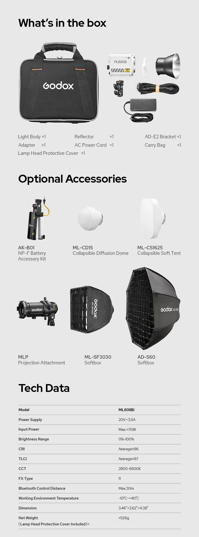 Super Lightweight and Compact Design.Weighing approximately 500g (light body only), the ML60II Bi boasts a compact square shape, offering one-hand grip, easy installation, and high portability.