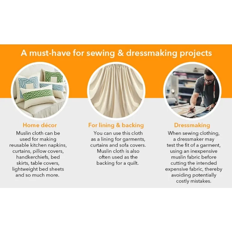 ✅ MULTIPLE USES: Muslin fabrics are a staple for fashion designers and quilters! Use them for backing, backdrops, embroidery, fittings, Draping and more. This fabric is great for curtains, apparel, aprons, sheets, quilting, and other crafts projects. It has a luxuriously rich feeling. Whether you're using this for pattern making or wall covers, this muslin will meet all your needs.