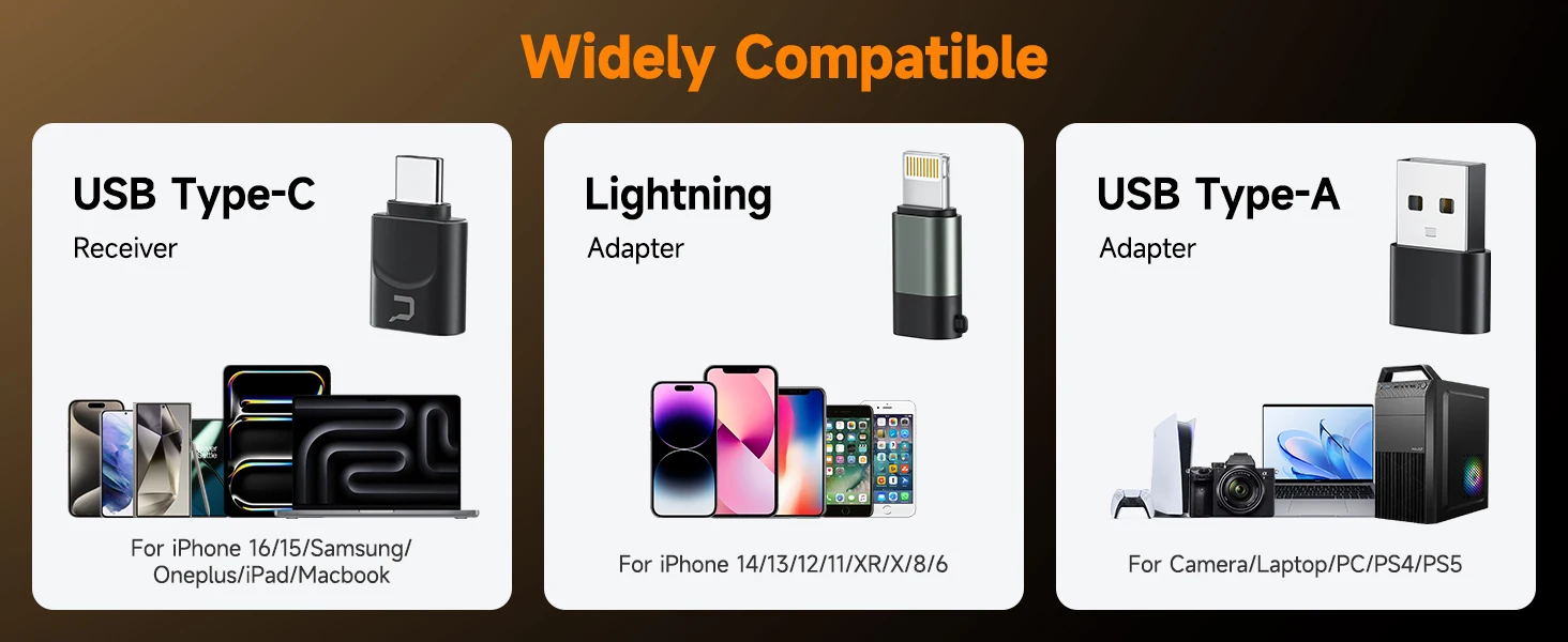 This versatile set ensures wide compatibility, including a USB Type-C receiver, Lightning adapter, and USB Type-A adapter.