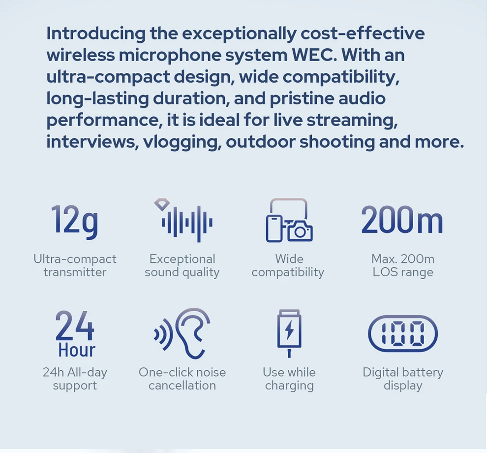WEC Portable Wireless Microphone 2.4Ghz System for Mobile Cameras Live Streaming$112.58PriceColor*SelectQuantity*Add to CartBuy Now